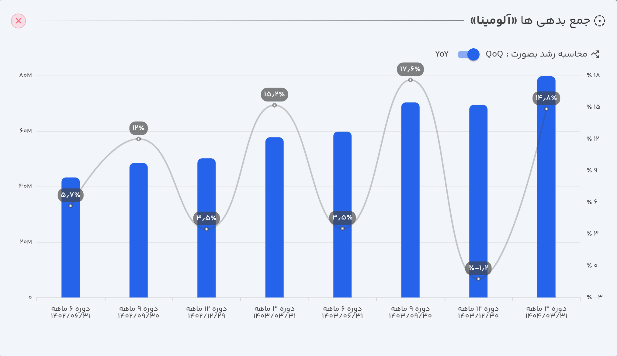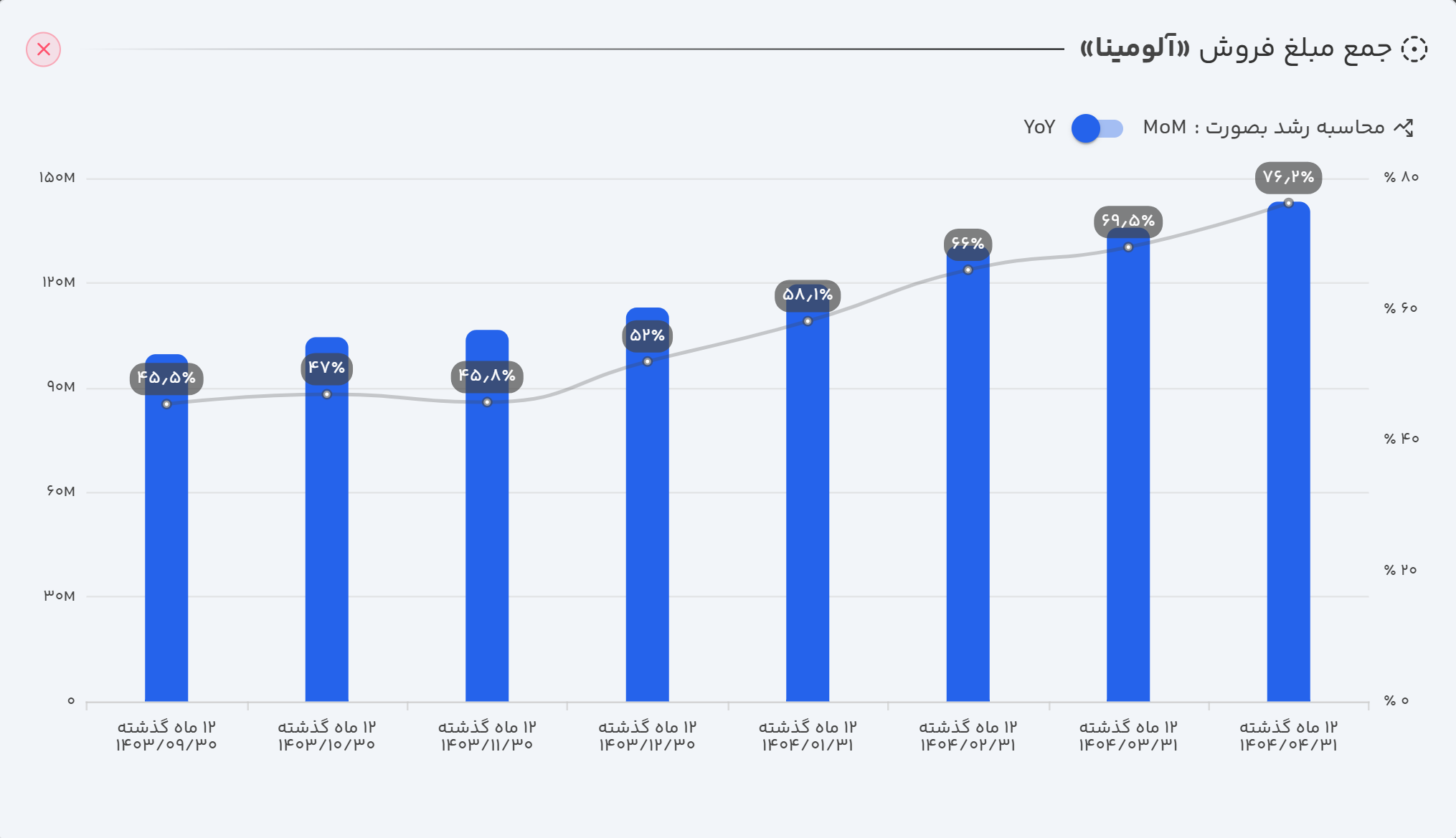 - عملکرد سالانه (TTM): در دوازده ماهه منتهی به تیر ۱۴۰۴، مجموع فروش شرکت به ۱۴.۳ همت رسید که حاکی از رشد ۷۶٪ در مقایسه با دوره مشابه سال قبل است.
