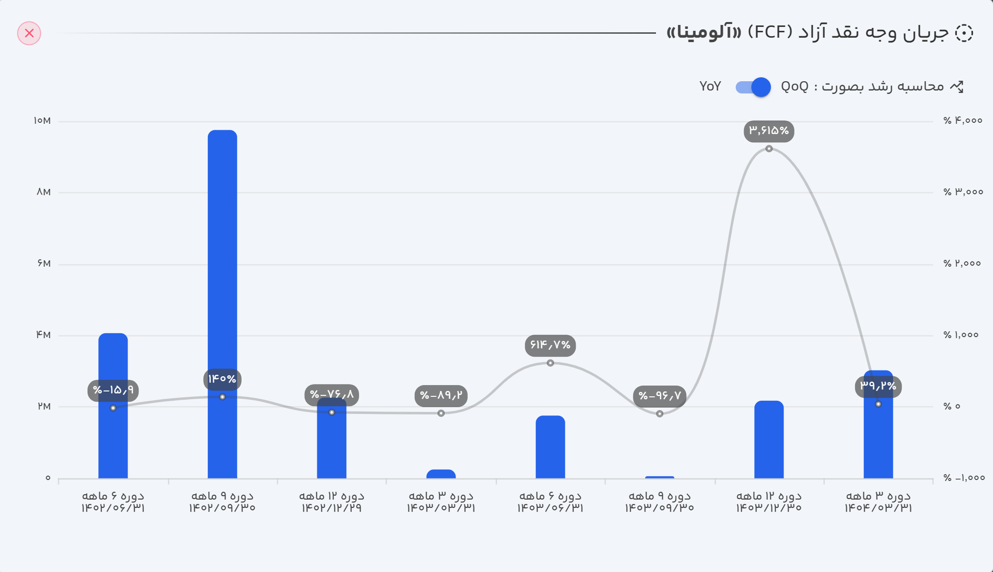جریان وجه نقد آزاد (FCF): جریان وجه نقد آزاد شرکت با رشد ۱۷۲٪ به ۱۳۴ میلیارد تومان در فصل و ۳۰۲ میلیارد تومان در دوره ۱۲ ماهه رسیده است. با این حال، این میزان از جریان نقد آزاد، تنها معادل ۱.۴٪ از ارزش بازار ۲۰.۶ همتی شرکت در زمان تدوین این گزارش است، که نسبتی نازل محسوب شده و بر ضعف ساختاری در این بخش تأکید دارد.