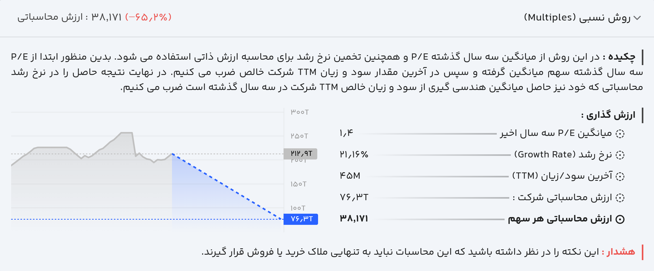 با در نظر گرفتن تاریخچه سودآوری و نرخ رشد فصلی ۲۱.۶ درصدی، این مدل ارزش بازار شرکت را در محدودهی ۷.۶۳ همت برآورد میکند که فاصله بسیار معناداری با ارزش فعلی بازار دارد.