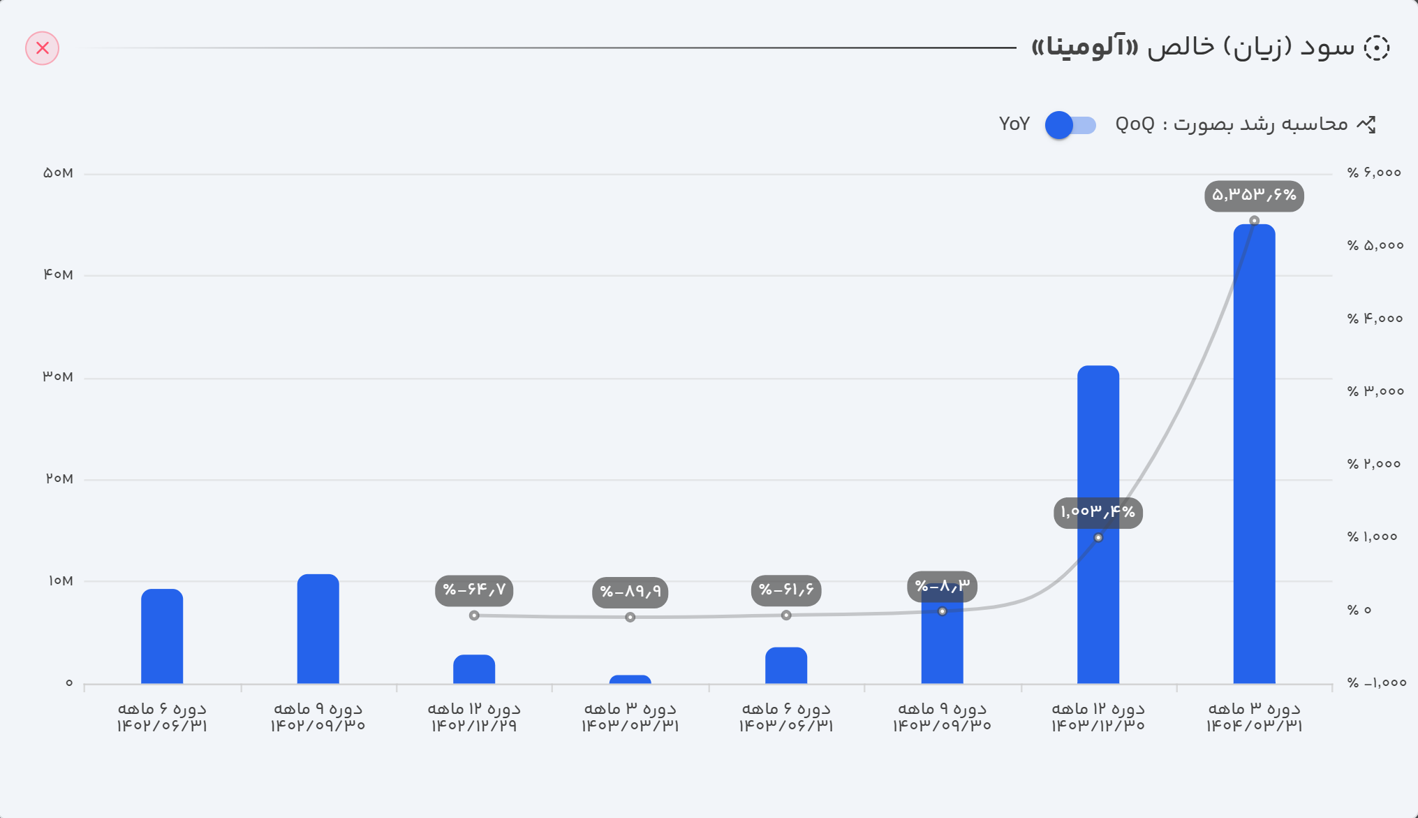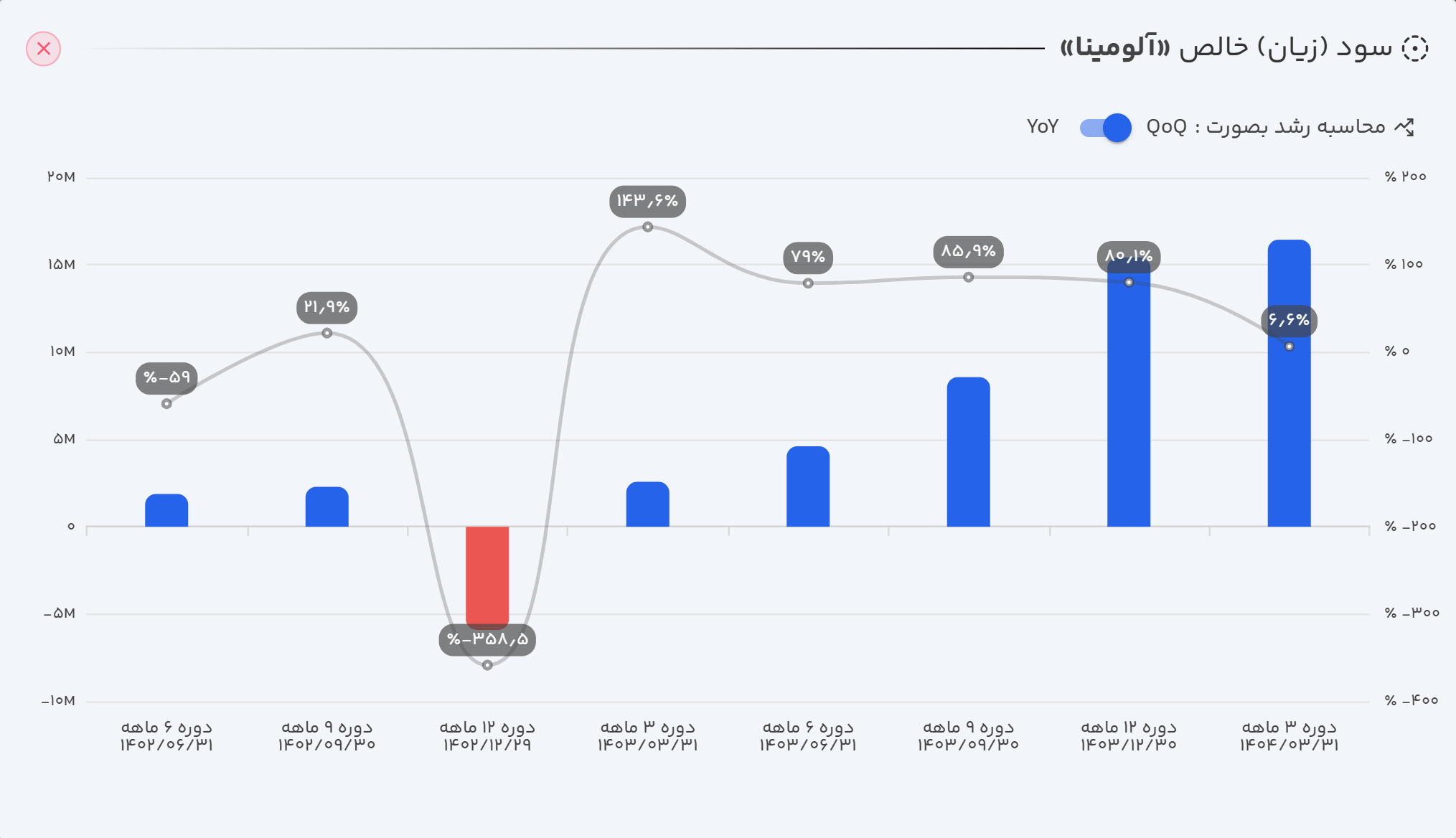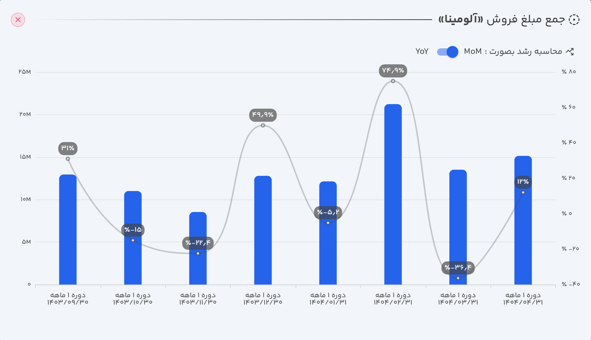 نماد "آلومینا" که در اسفند ۱۴۰۳ در محدوده ارزش بازار ۱۱ همت معامله میشد، یک روند صعودی تا قله ۲۵ همت را تجربه کرد. پس از آن، قیمت تا محدوده ۱۹ همت اصلاح شد و به دنبال انتشار گزارش مالی مثبت سه ماهه ۱۴۰۴، مجدداً در مسیر صعود به سمت سقف تاریخی خود قرار گرفته است.