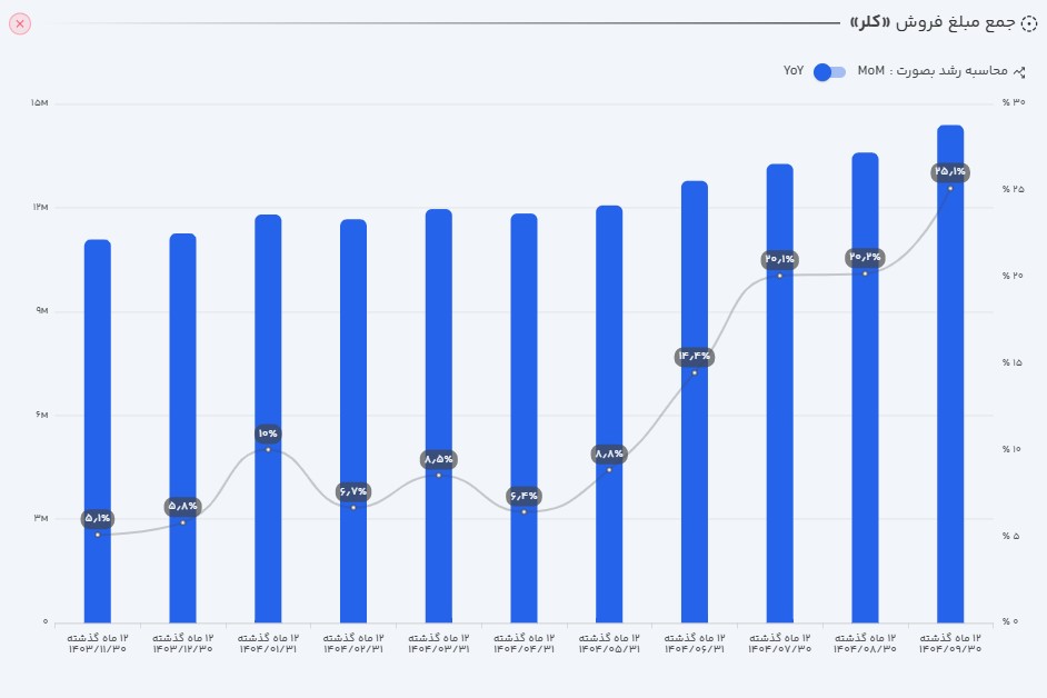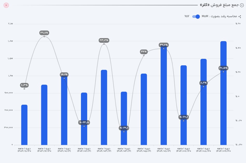 - عملکرد ماهانه: کلر در آذر ماه 1404 موفق به ثبت 180میلیاد تومان فروش شد. این رقم در مقایسه با ماه قبل 20 درصد رشد داشته است و یک رکود در فروش ماهانه شرکت کسب شده است.