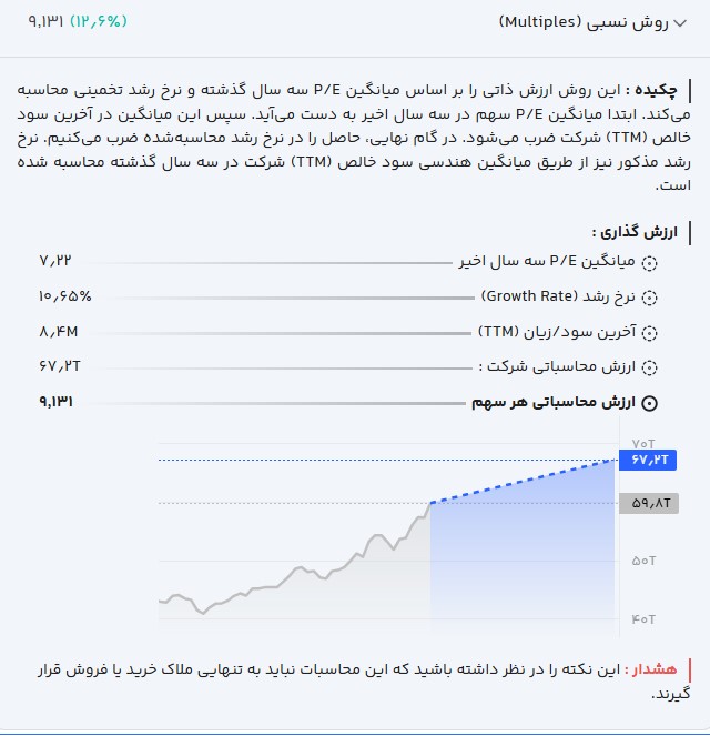 با توجه به سابقه سودآوری و رشد فصلی 10.65 درصدی، مدل ارزشگذاری نسبی ارزش بازار شرکت را محدوده 6.72 هزار میلیارد تومان برآورد میکند؛ که به معنای معامله سهم تقریبا در ارزش ذاتی میباشد.