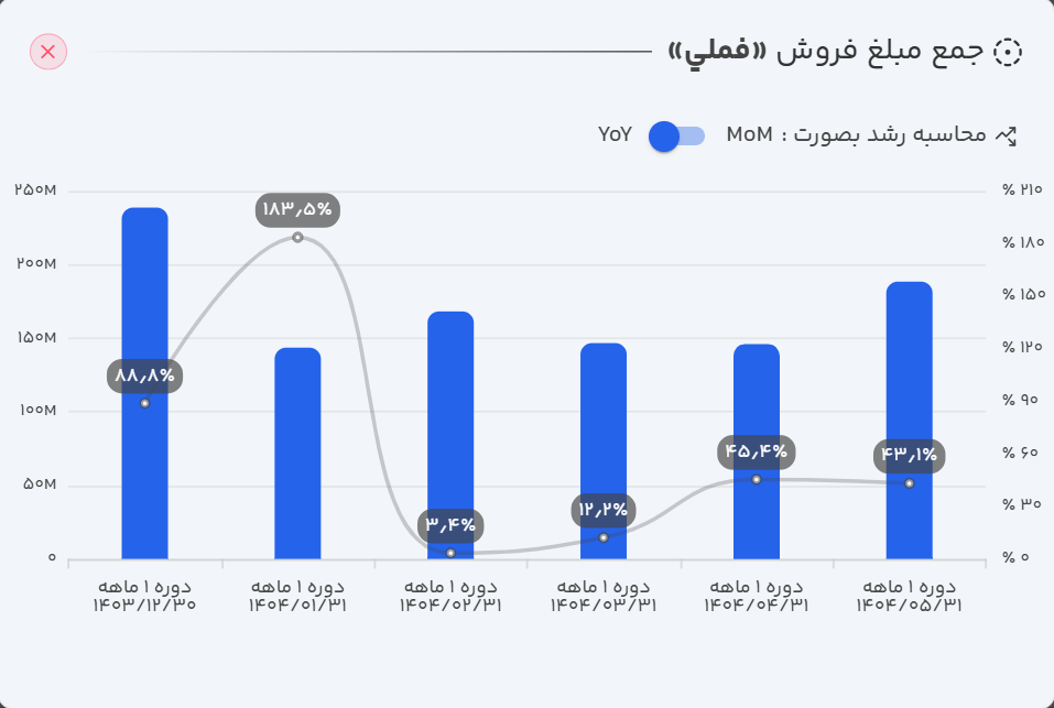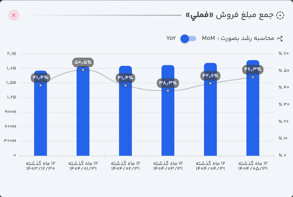 - عملکرد تجمعی امیدبخش: در ۵ ماهه نخست سال ۱۴۰۴، فملی موفق به تحقق فروش ۷۹.۳ هزار میلیارد تومانی شد. این عدد در مقایسه با فروش ۵۷.۵ هزار میلیارد تومانی مدت مشابه سال قبل، رشد ۳۸ درصدی را به ثبت رسانده و از بهبود محسوس در عملکرد تجمعی شرکت خبر میدهد.