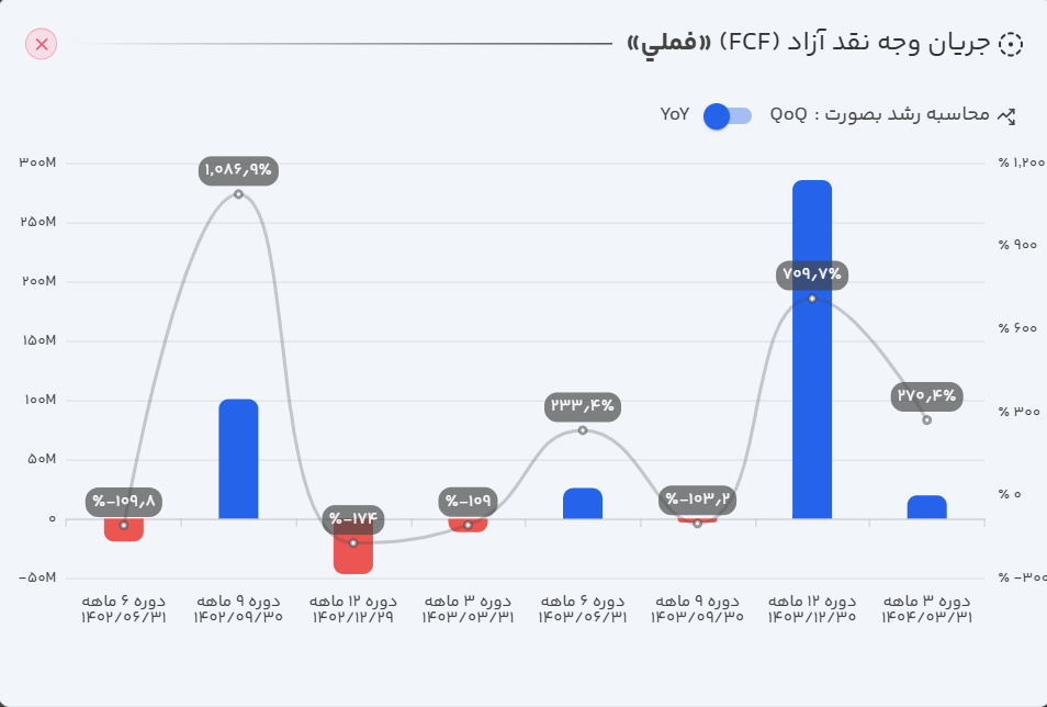 جریان وجه نقد آزاد (FCF): با وجود هزینههای سرمایهای سنگین، جریان وجه نقد آزاد شرکت (FCF) به ۱.۹۵ هزار میلیارد تومان رسیده است که نسبت به سال گذشته رشد فوقالعاده ۲۷۰ درصدی را نشان میدهد. این یک سیگنال مثبت از توانایی شرکت در تولید پول نقد پس از انجام سرمایهگذاریهای ضروری است.