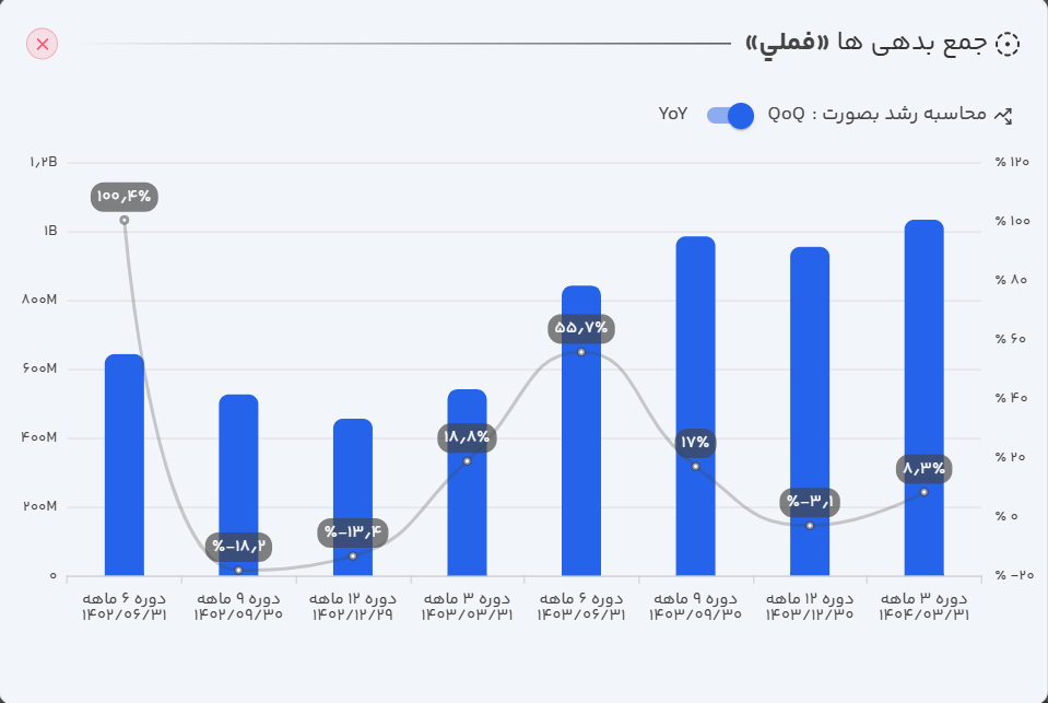 - بدهیها: با افزایش ۸ درصدی، از ۹۵ هزار میلیارد تومان به ۱۰۳ هزار میلیارد تومان افزایش یافته است.