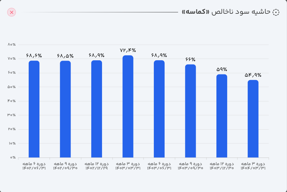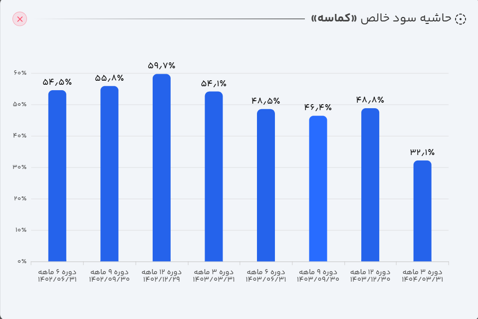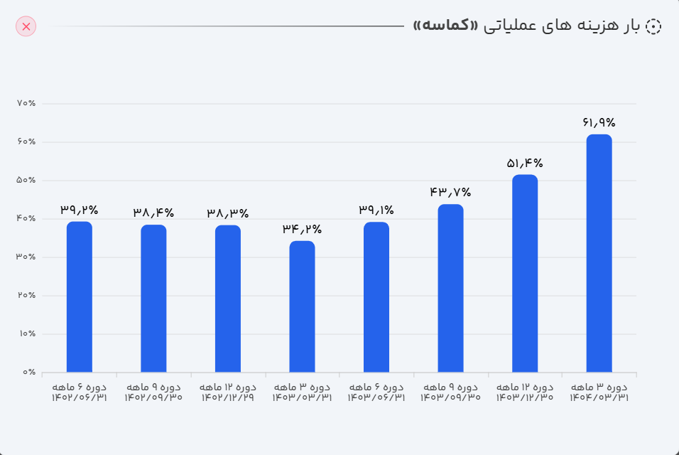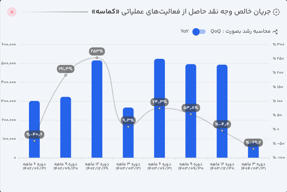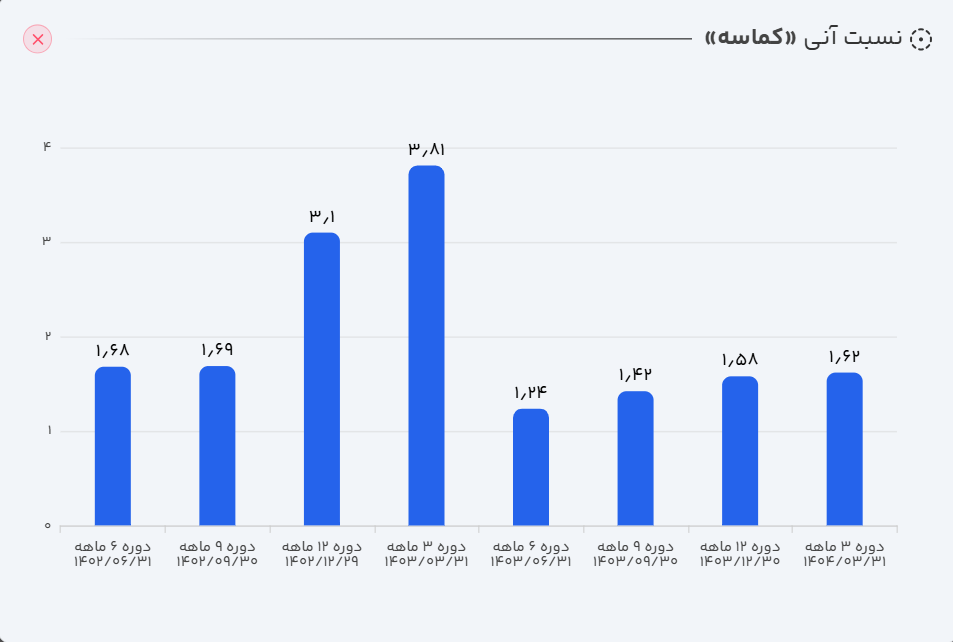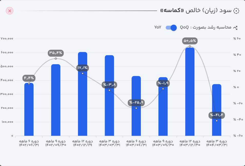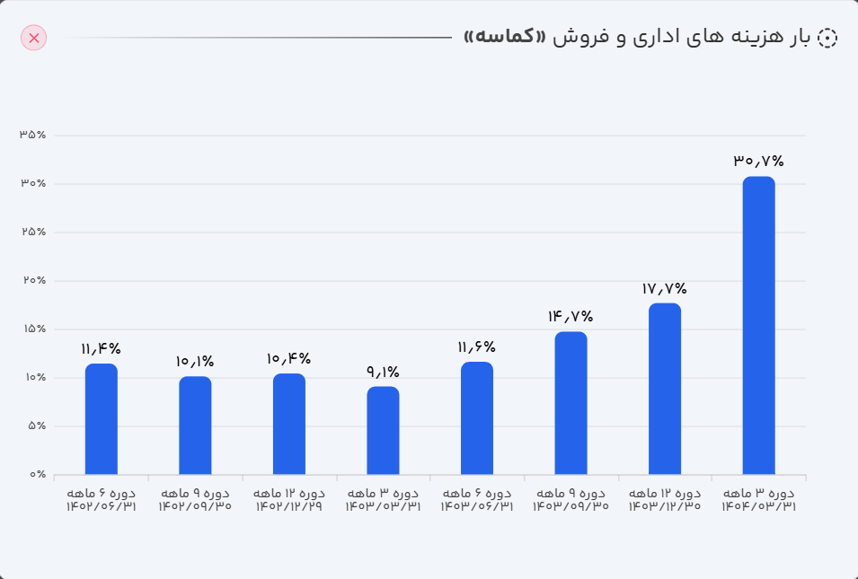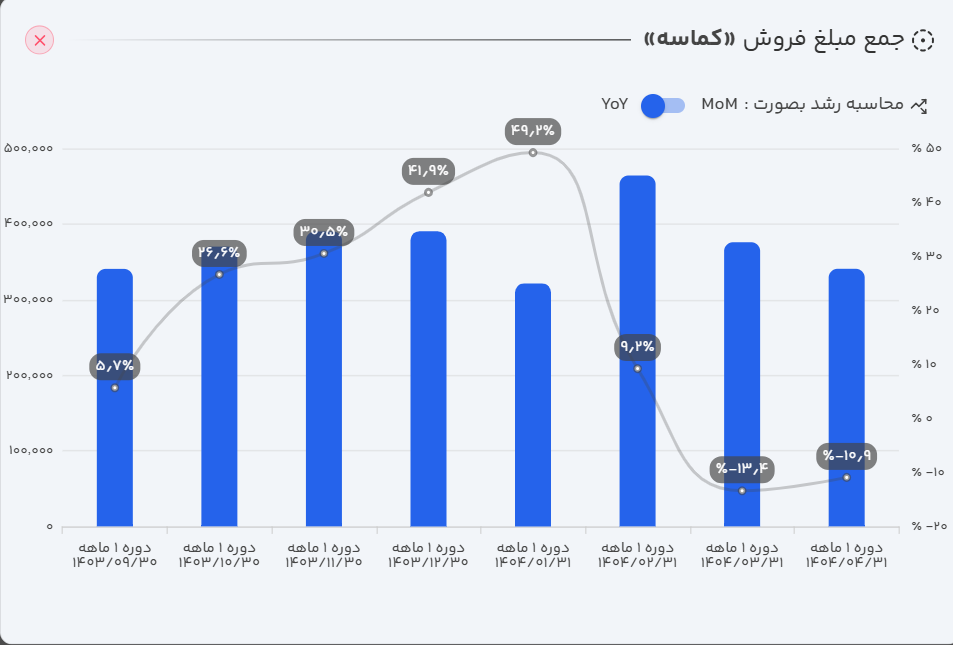 - عملکرد ماهانه: کماسه در تیرماه ۱۴۰۴ موفق به فروش ۳۴ میلیارد تومانی محصولات خود شد. این رقم افتی ۱۰ درصدی را هم نسبت به ماه گذشته و هم نسبت به ماه مشابه سال قبل نشان میدهد که سیگنالی نگرانکننده در روند فروش کوتاهمدت است.