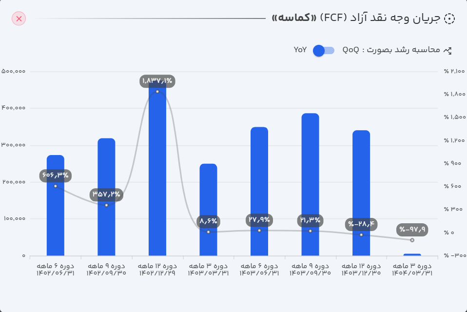 جریان وجه نقد آزاد (FCF): شرکت در ۱۲ ماه گذشته، ۱۰۸ میلیارد تومان وجه نقد آزاد تولید کرده است که معادل ۶.۸٪ از ارزش بازار فعلی آن است. این نسبت نشان میدهد که بحرانهای فعلی شرکت تا حد زیادی توسط فعالان بازار شناسایی شده و در قیمت فعلی سهم منعکس شده است.