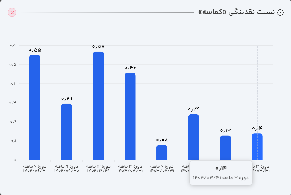 بررسی ترازنامه نشان میدهد که نسبت نقدینگی شرکت در فصول اخیر به سطح بحرانی ۰.۱۵ رسیده است. این سطح از منظر توانایی شرکت در بازپرداخت تعهدات کوتاهمدت، بسیار نگرانکننده است. این افت شدید نقدینگی که همزمان با افزایش هزینههای تولید رخ داده، فشار مضاعفی را بر ساختار مالی شرکت وارد کرده است. تداوم این وضعیت میتواند شرکت را با بحران نقدینگی مواجه سازد و توانایی آن برای ادامه تولید، پرداخت بدهیها و اجرای طرحهای توسعهای را به شدت محدود کند.