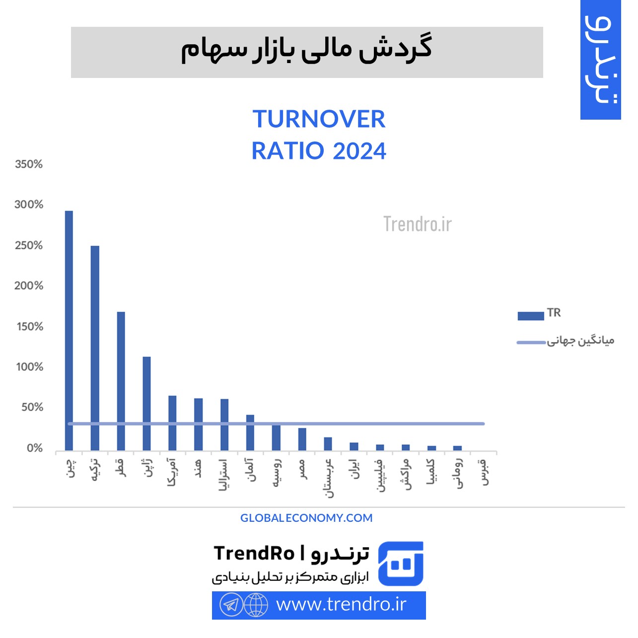 همانطور که مشاهده میشود، بازار ایران دارای گردش مالی حدود 10 درصد است که جزو دسته کشورهایی است که گردش نقدینگی در آن ضعیف است.