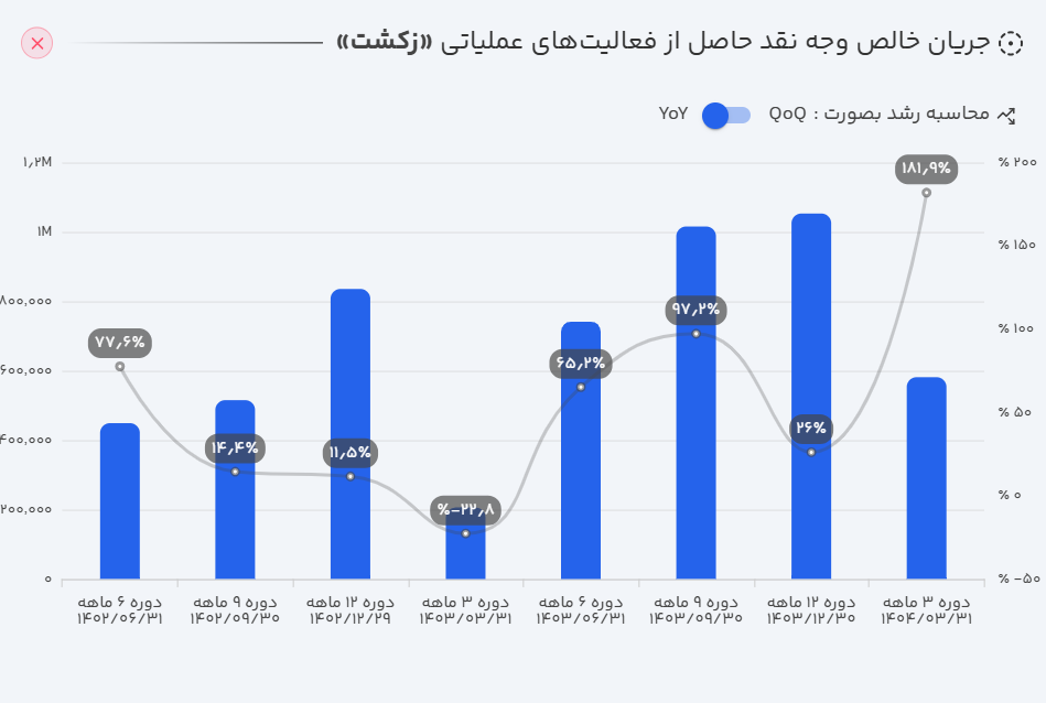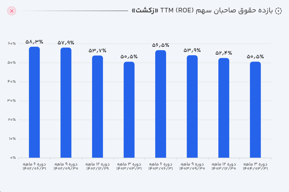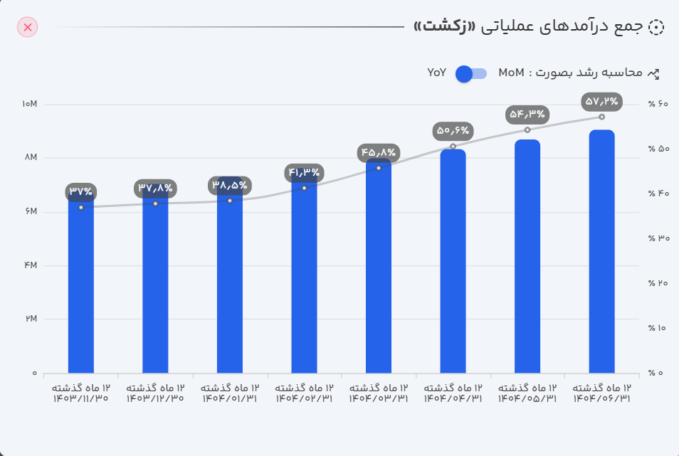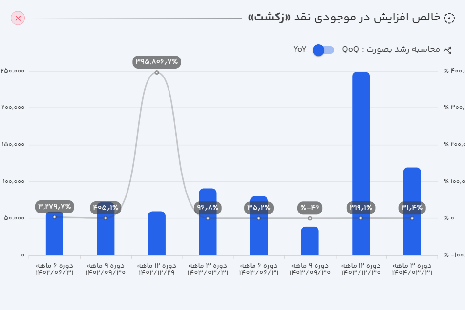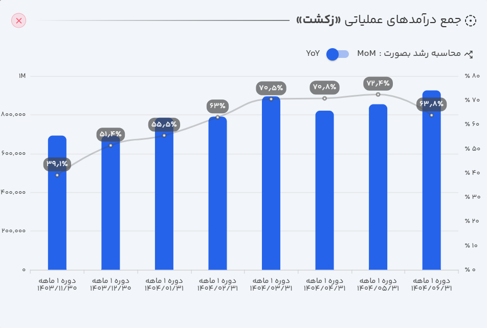- عملکرد سالانه: بر اساس گزارشهای منتشر شده، زکشت در ۱۲ ماهه منتهی به شهریور ۱۴۰۴ توانسته است ۹۰۴ میلیارد تومان فروش محقق کند که این میزان در مقایسه با دوره مشابه سال قبل، حاکی از رشد ۵۷ درصدی است.