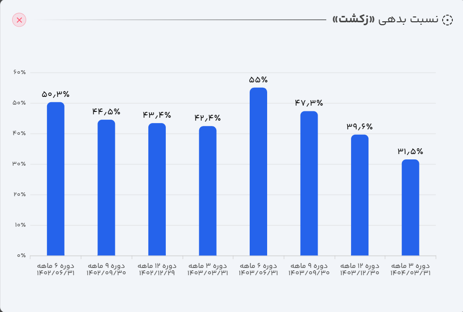 - نسبت بدهی: نسبت بدهی شرکت از ۵۵ درصد به ۳۱ درصد رسیده است. این کاهش، بیانگر کاهش اتکای شرکت به منابع مالی خارجی و بهبود ساختار سرمایه آن است که ریسک مالی را کاهش میدهد.