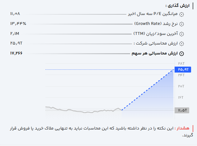 با توجه به سابقه سودآوری و رشد فصلی ۱۳.۴۴ درصدی، مدل ارزشگذاری نسبی، ارزش بازار شرکت را حدود ۲.۶ هزار میلیارد تومان برآورد میکند؛ یعنی سهام با قیمتی معامله میشود که تا ارزش برآوردی شرکت، حدود ۱۲۲ درصد فاصله (پتانسیل رشد) دارد. در صورت ادامه سودسازی مؤثر و مدیریت مطلوب هزینهها، میتوان ارزشهای بالاتری برای سهم متصور بود.